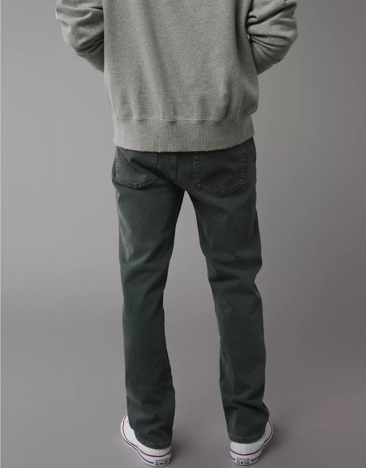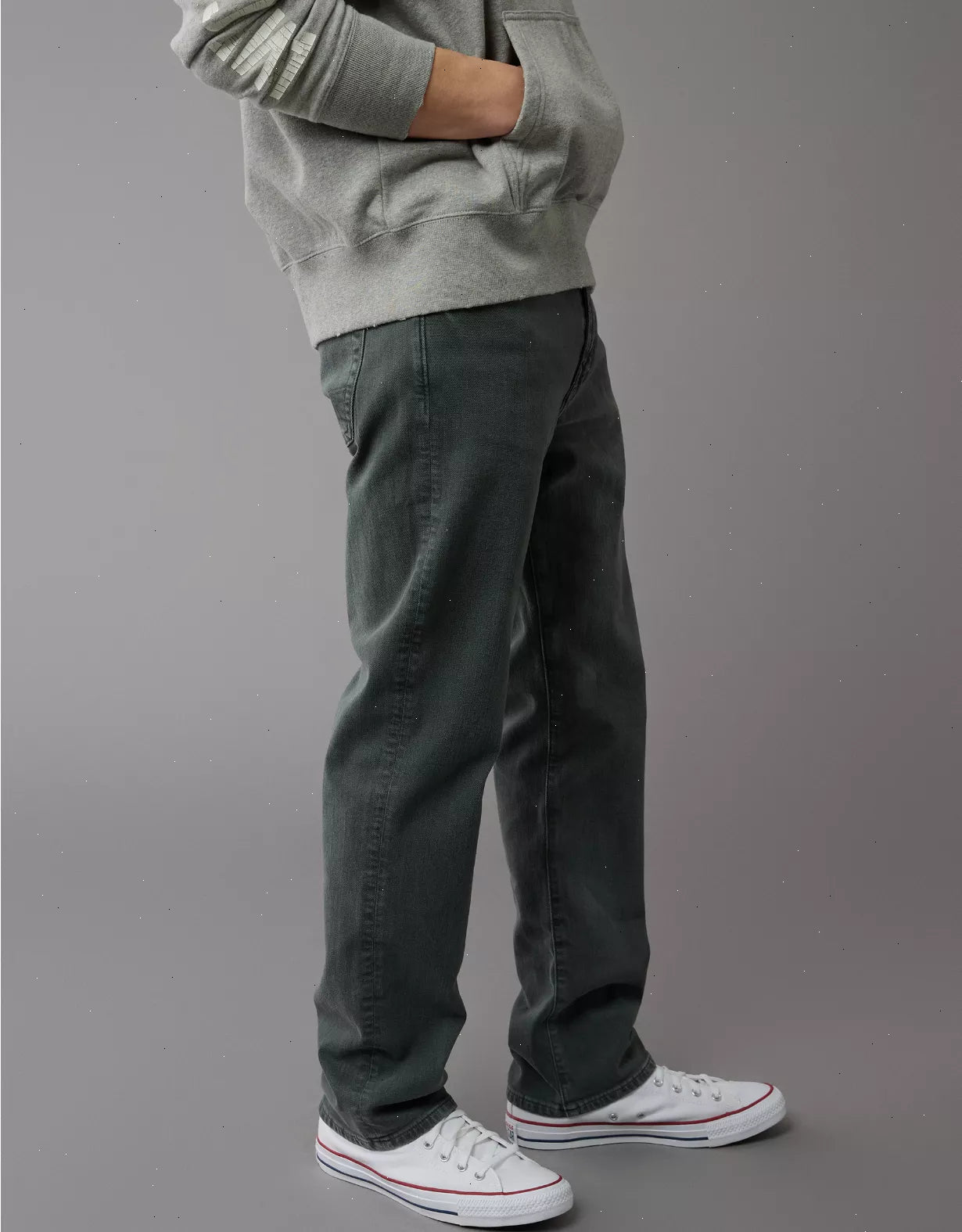Relaxed through the thigh, straight through the knee and leg.