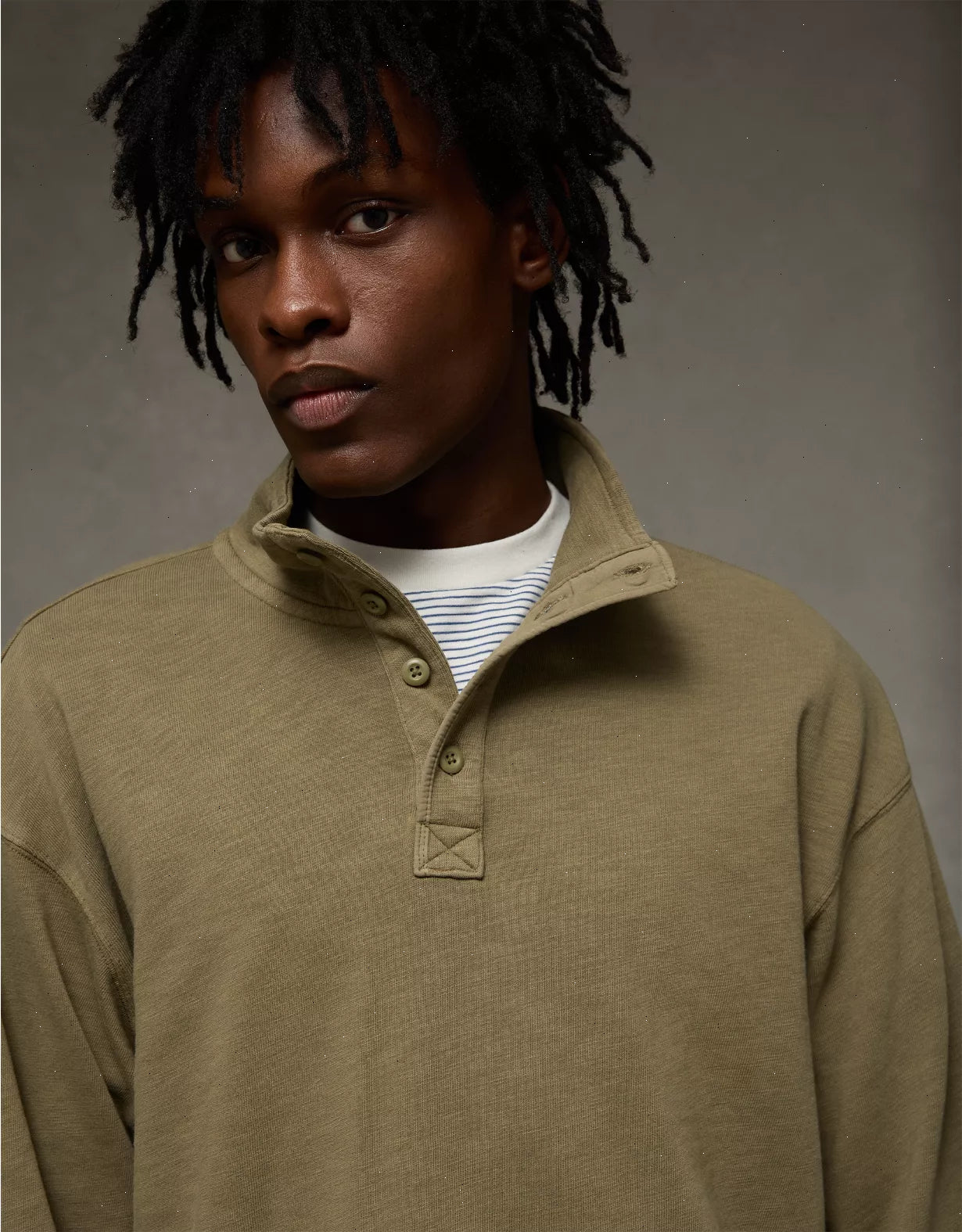 This long-sleeved tee is constructed from a heavyweight cotton slub jersey and features a button-up mock neck for extra cozy. Designed to be a second layer over a short-sleeve tee.